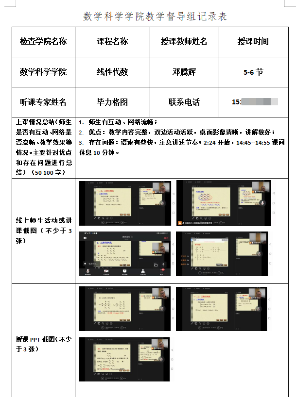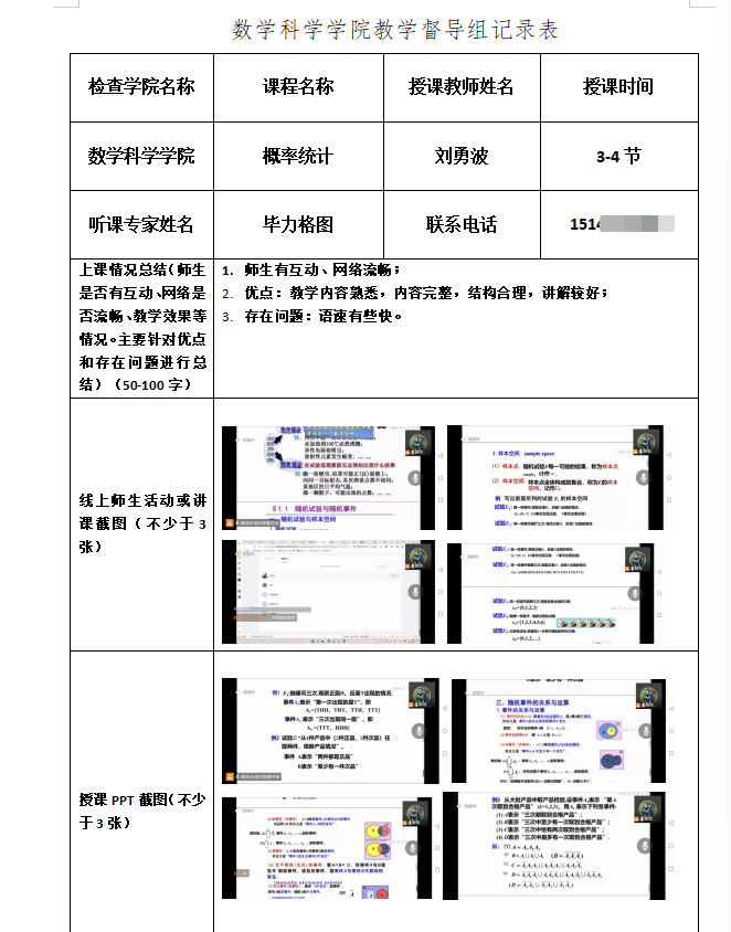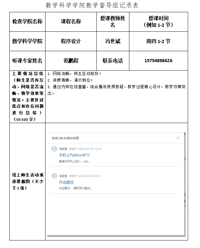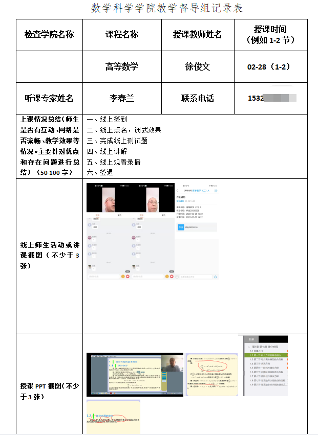 学院领导班子、教学委员会和督导组通过随机进入线上课程观看教师在线授课实况、查阅在线教学资源、了解学生在线学习互动等方式开展教学督导检查,并填写教学督导记录表,及时反馈督导检查情况。