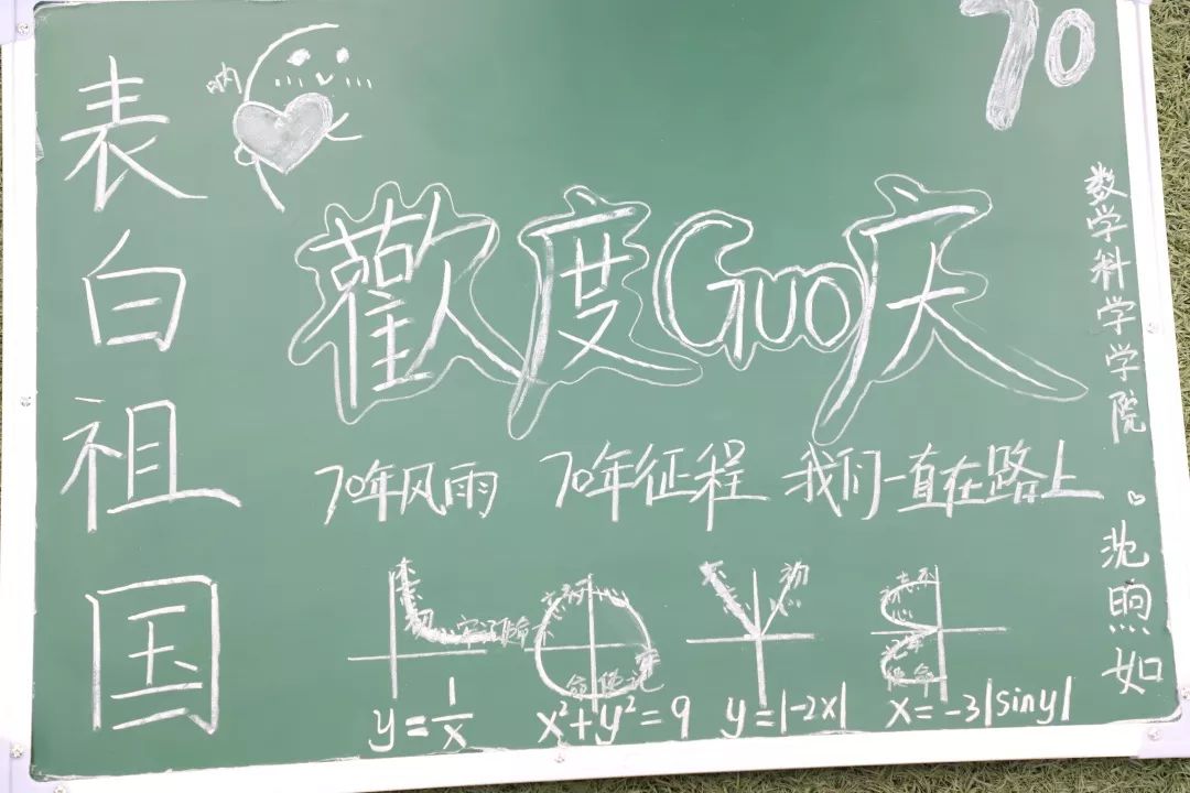 为喜迎建国 70 周年,展示 2019 级师范生板书水平,培养师范生专业技能意识。2019年9月27日下午5:00,sjb世俱杯官方网站开展“喜迎建国 70 周年,2019 级师范新生板书比赛展示”活动。sjb世俱杯官方网站19级全体师范生积极参加本次活动。同学们通过书写粉笔字表达自己对建国70周年的庆祝。