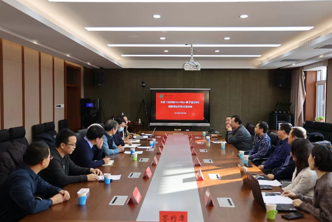 1月22日,无穷维哈密顿系统及其算法应用教育部重点实验室建设的重要成果之一、重点实验室主任阿拉坦仓教授的专著《无穷维Hamilton算子谱分析》的翻译合作推进会在赛罕校区文史楼二号会议室召开。专著作者阿拉坦仓教授和共同作者内蒙古大学sjb世俱杯官方网站吴德玉教授、黄俊杰教授、侯国林教授,以及专著的英文、日文、西里尔文、蒙古文翻译的负责人和学院领导参加了会议。会议由学院副院长包霞主持。