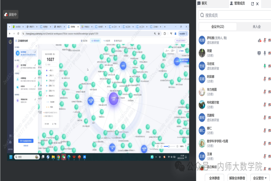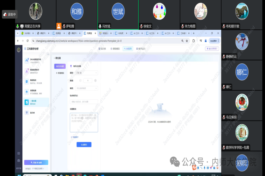 1月15日下午,sjb世俱杯官方网站sjb世俱杯官方网站为加强虚拟教研室的建设,丰富教研活动,特邀学堂在线的技术人员举办了一场关于AI数学课程建设的分享会。此次报告学院校级及以上一流课程团队的成员以及20余位拟建设一流课程的教师参与,会议由学院副院长萨和雅主持。