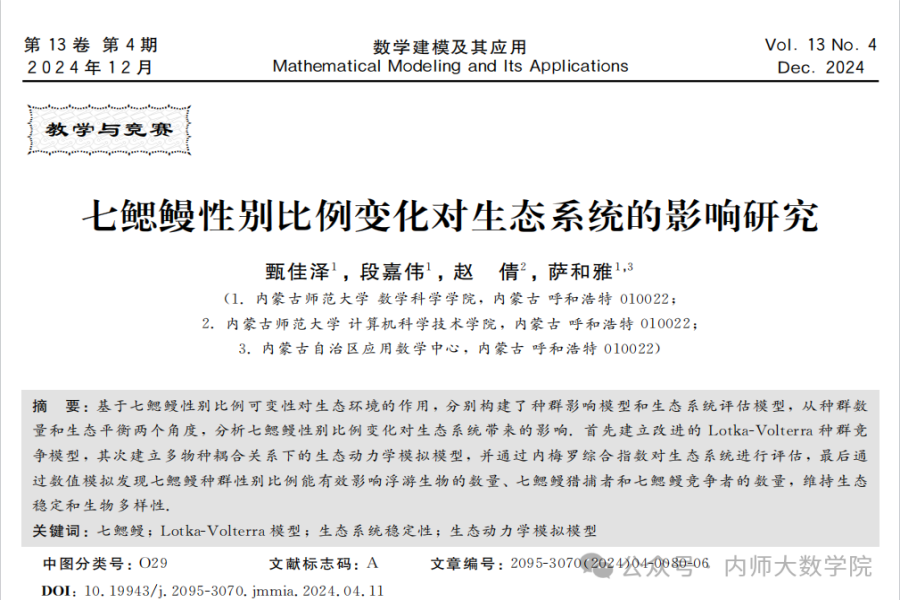 近日,世俱杯数学与应用数学专业2021级本科生甄佳泽、段嘉伟,以及数据科学与大数据技术专业2021级本科生赵倩在萨和雅教授的指导下完成的学术论文《七鳃鳗性别比例变化对生态系统的影响研究》被数学权威期刊《数学建模及其应用》录用。世俱杯数学与应用数学专业2021级本科生甄佳泽为第一作者,,通讯作者为萨和雅教授。《数学建模及其应用》为中国工业与应用数学学会、全国大学生数学建模竞赛组委会会刊,致力于报道、推动和引领与数学建模有关的研究和竞赛动态。