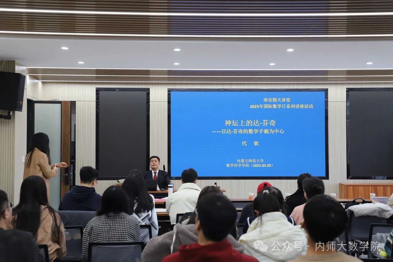 3月20日下午,sjb世俱杯官方网站“3.14国际数学日系列活动”——明安图大讲堂第四讲在sjb世俱杯官方网站盛乐校区内蒙古自治区应用数学中心报告厅进行。sjb世俱杯官方网站科学技术史研究院代钦教授应邀作了题为“神坛上的达·芬奇——以达·芬奇数学手稿为中心”的学术讲座。世俱杯师生代表100余人聆听了本次讲座,讲座由包霞副院长主持。