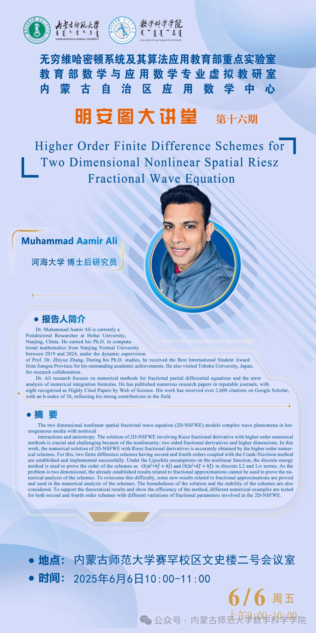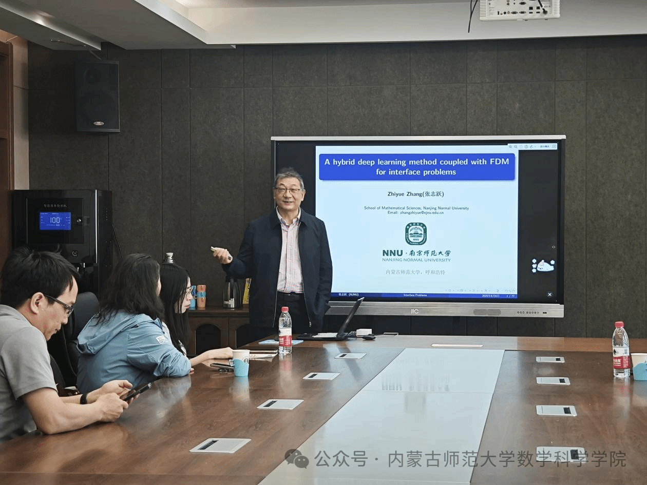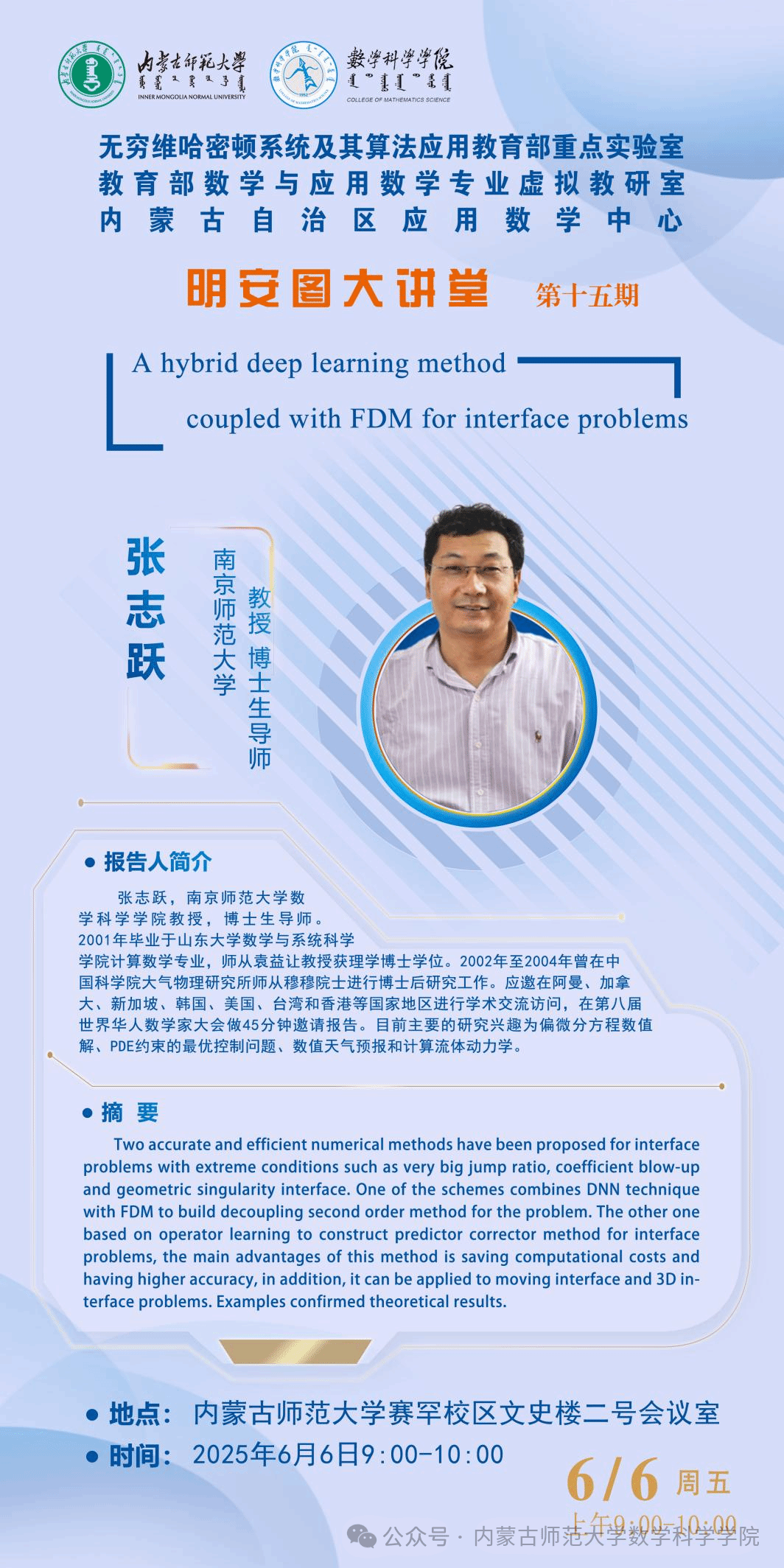 6月6日,sjb世俱杯官方网站明安图大讲堂在sjb世俱杯官方网站赛罕校区文史楼2号会议室成功举办。本次讲座特邀南京师范大学张志跃教授与河海大学博士后研究员ALI作专题学术报告。两场报告分别聚焦深度学习求解界面问题与分数阶微分方程的高精度数值方法,现场互动热烈。
