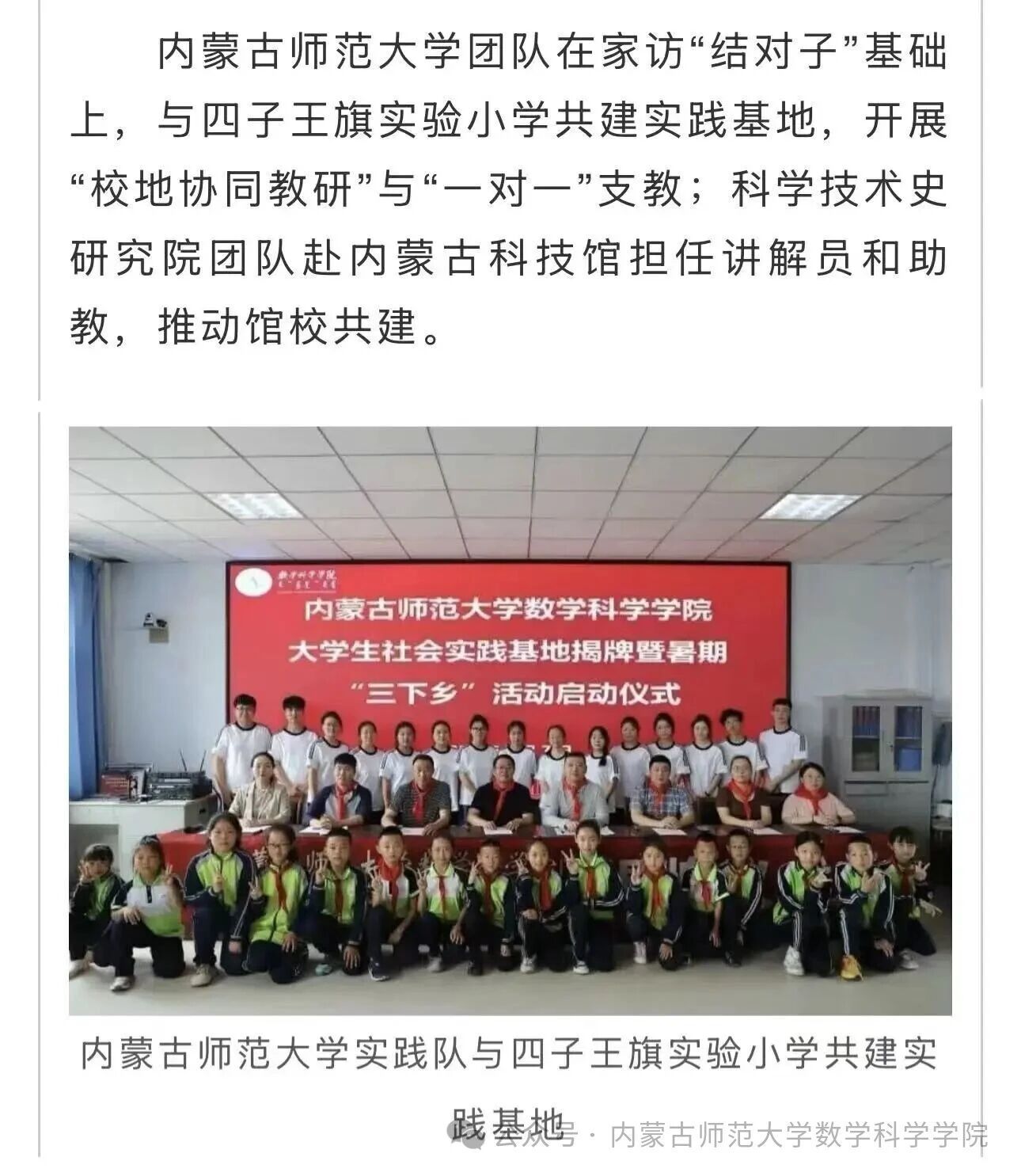 9月17日,内蒙古教育厅发布了“青春聚力两大件事”系列报道,主题为“在守护北疆安全中彰显青年的使命与担当”,世俱杯三下乡实践队与四子王旗实验小学共建实践基地的活动也被纳入其中。