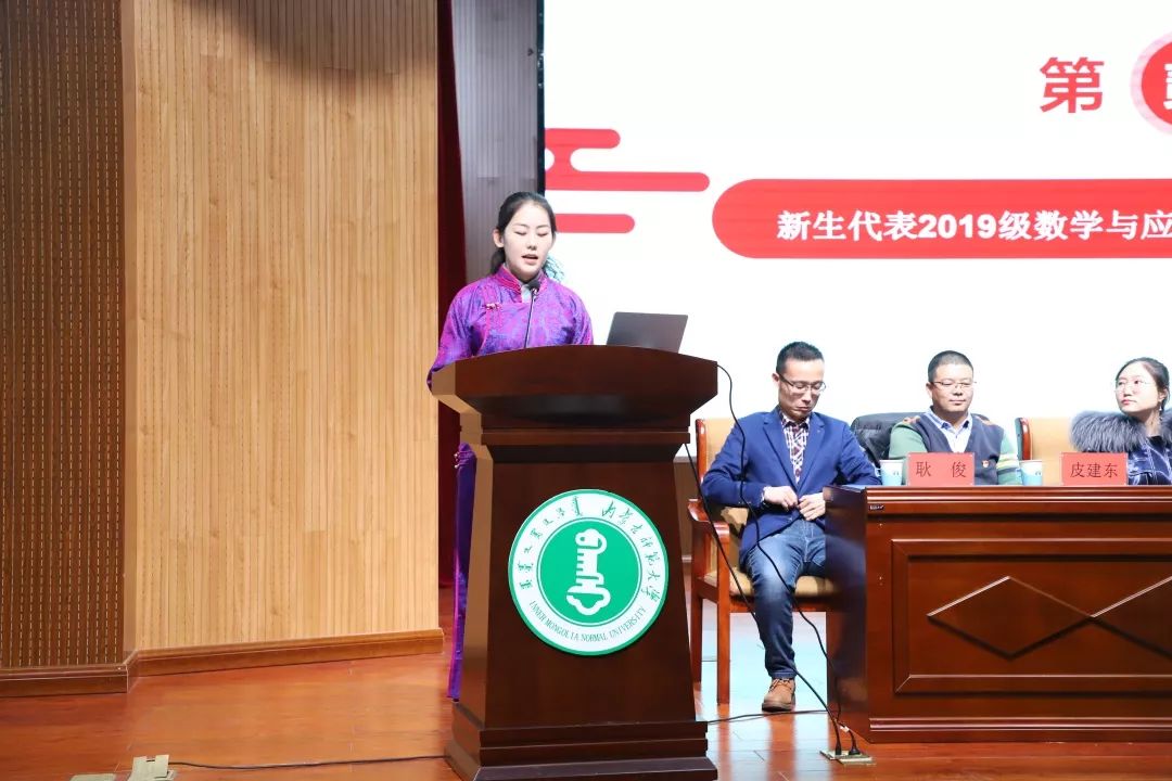 2019级新生代表道日苏拉同学表达了在接下来的四年里,将会刻苦学习,尊师重道,与同学们怀揣共同的追求,一起拼搏努力,奋勇向前!