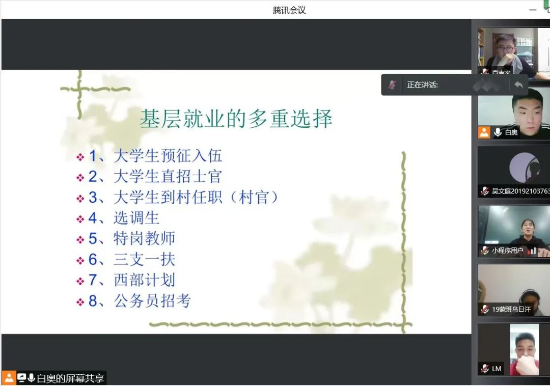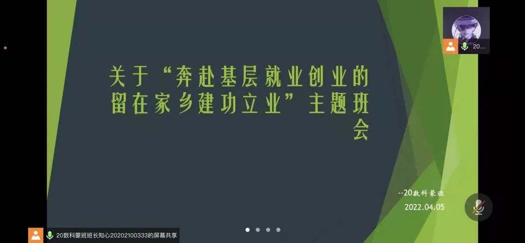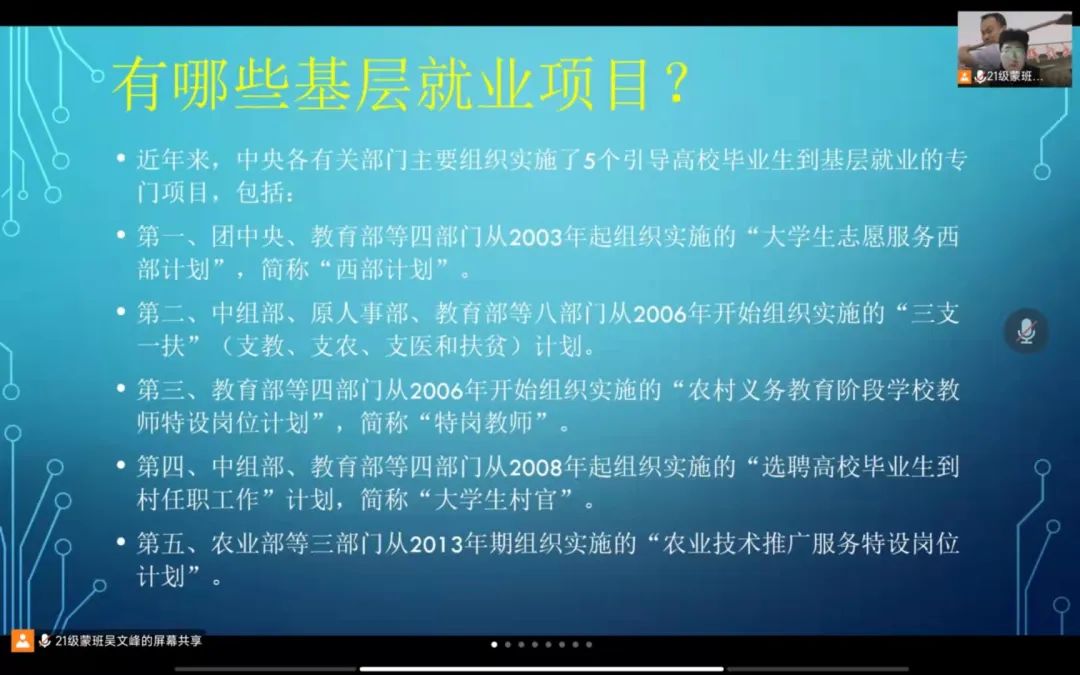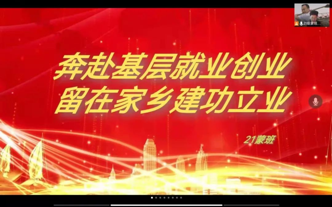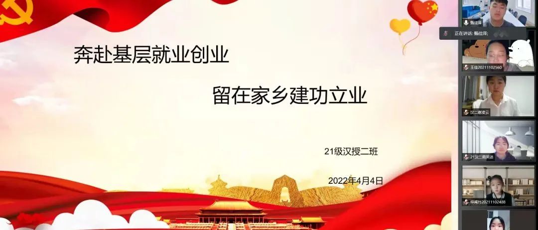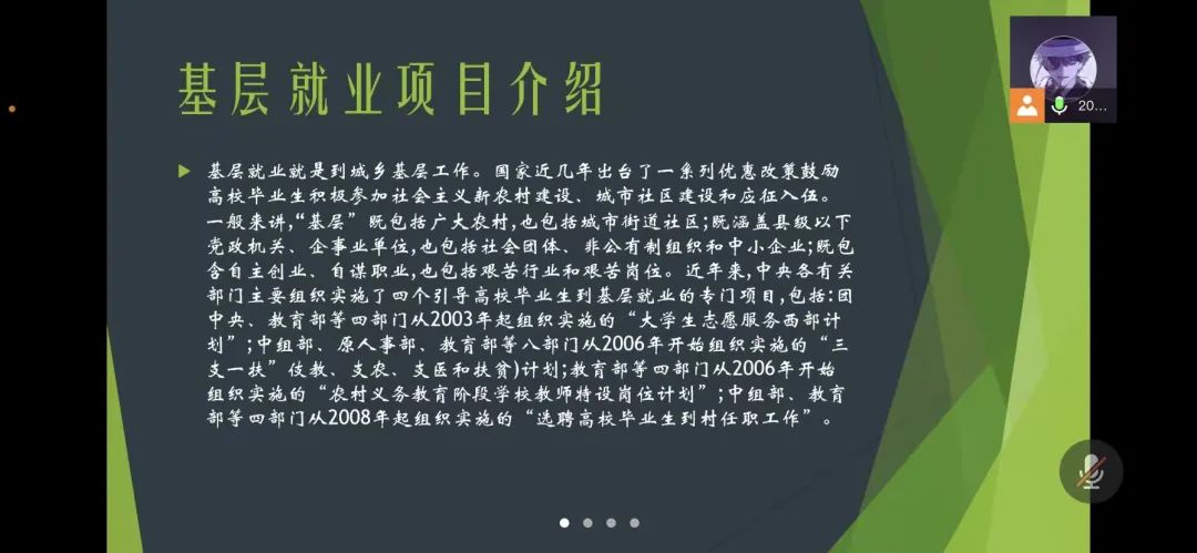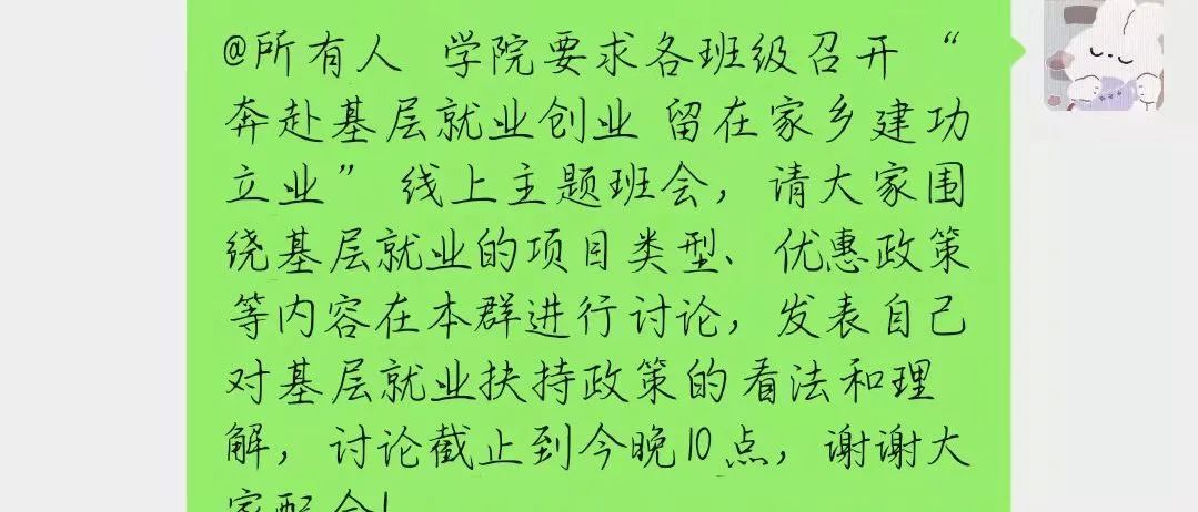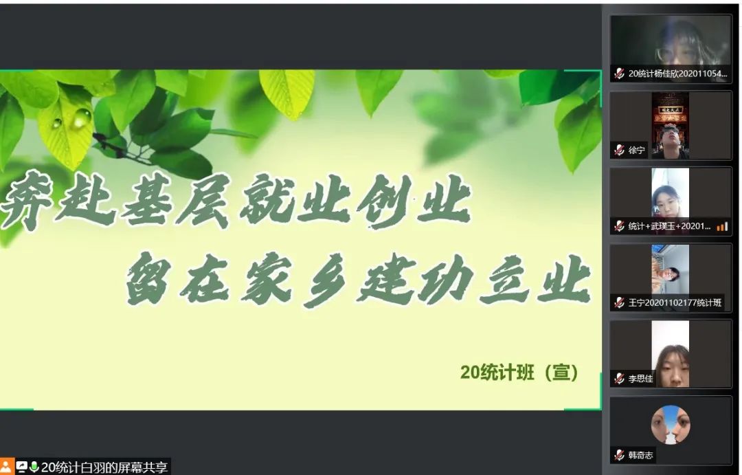 国家近几年出台了一系列优惠政策鼓励高校毕业生积极参加社会主义新农村建设、城市社区建设。为进一步让同学们了解基层就业,sjb世俱杯官方网站各班级开展“奔赴基层就业创业,留在家乡建功立业”线上主题班会,针对基层就业的项目类型,优惠政策等内容进行学习,在充分理解基层就业扶持政策的基础上引导各班同学们加入基层就业。