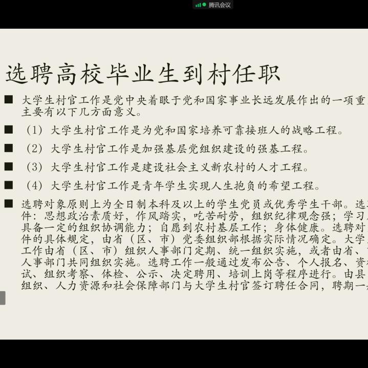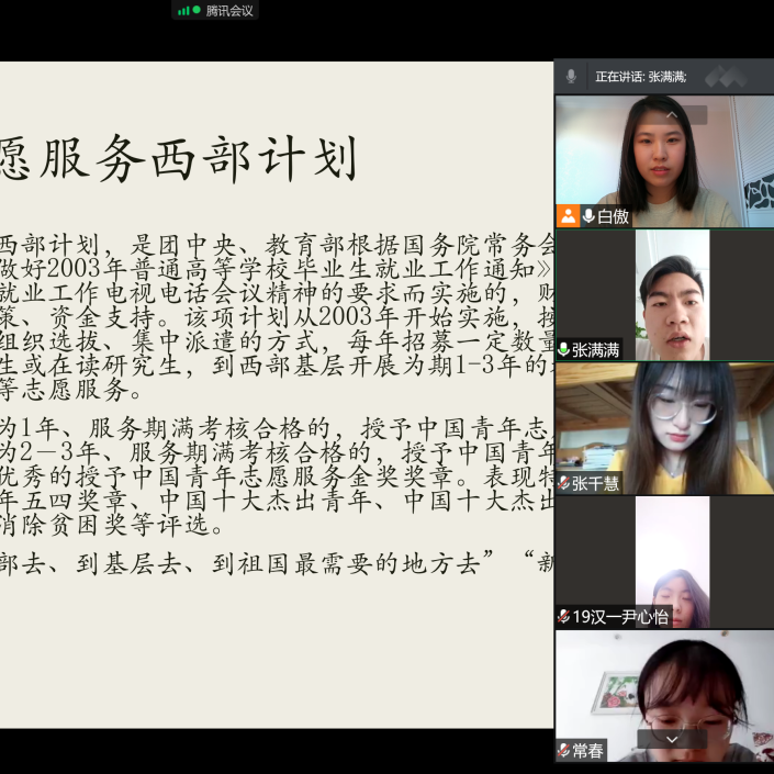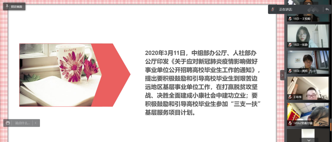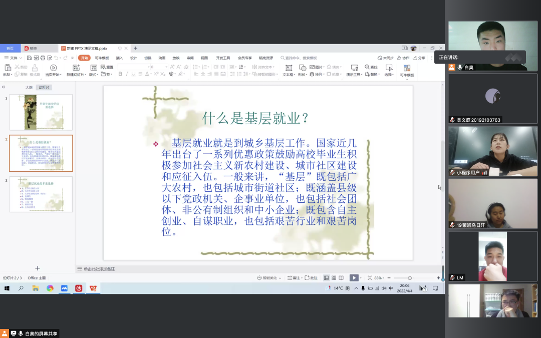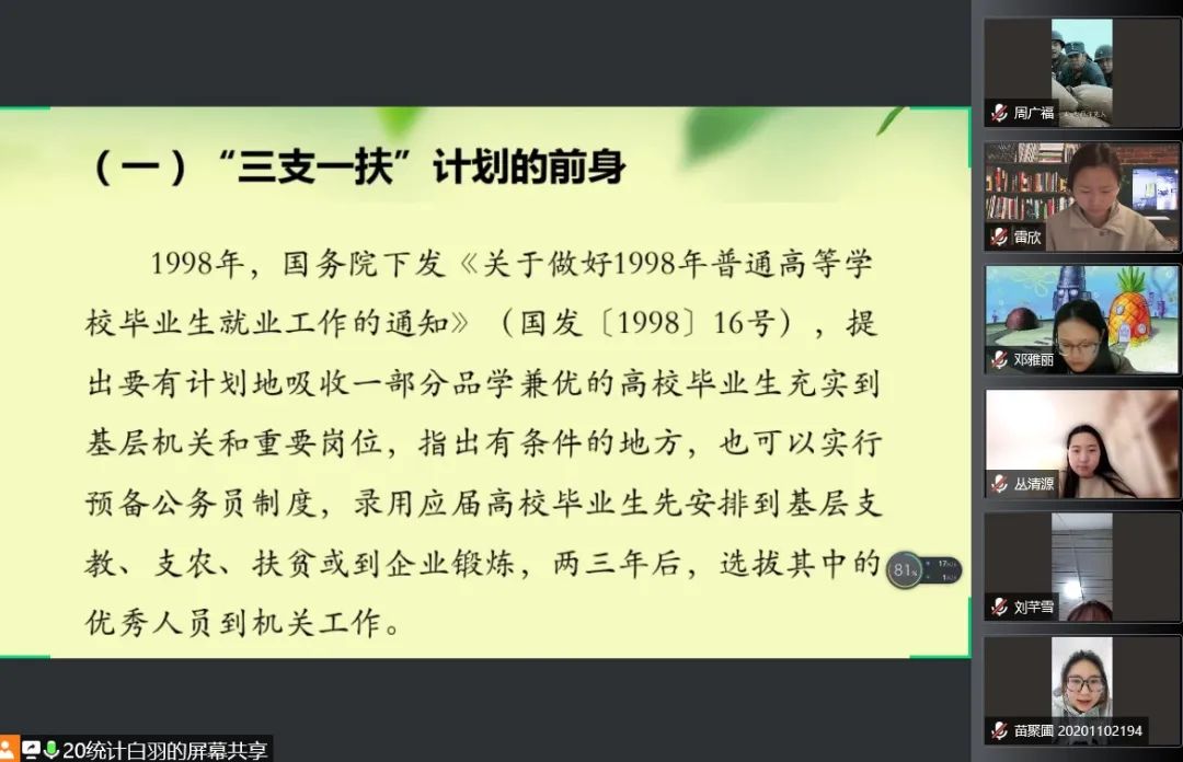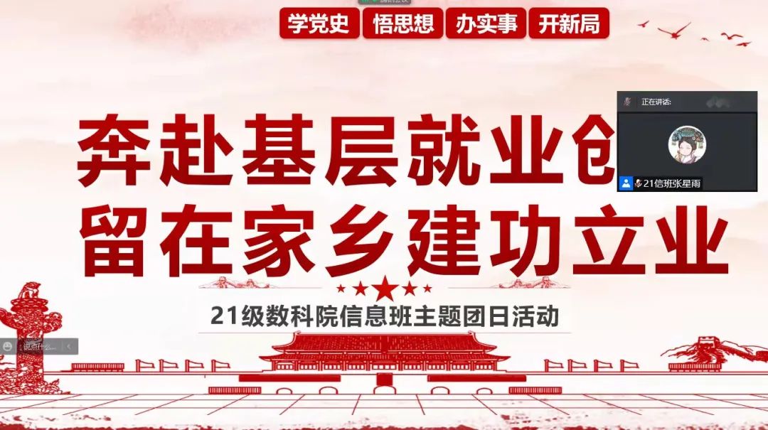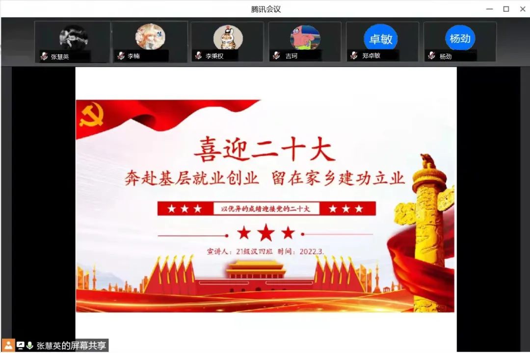 国家近几年出台了一系列优惠政策鼓励高校毕业生积极参加社会主义新农村建设、城市社区建设。为进一步让同学们了解基层就业,sjb世俱杯官方网站各班级开展“奔赴基层就业创业,留在家乡建功立业”线上主题班会,针对基层就业的项目类型,优惠政策等内容进行学习,在充分理解基层就业扶持政策的基础上引导各班同学们加入基层就业。