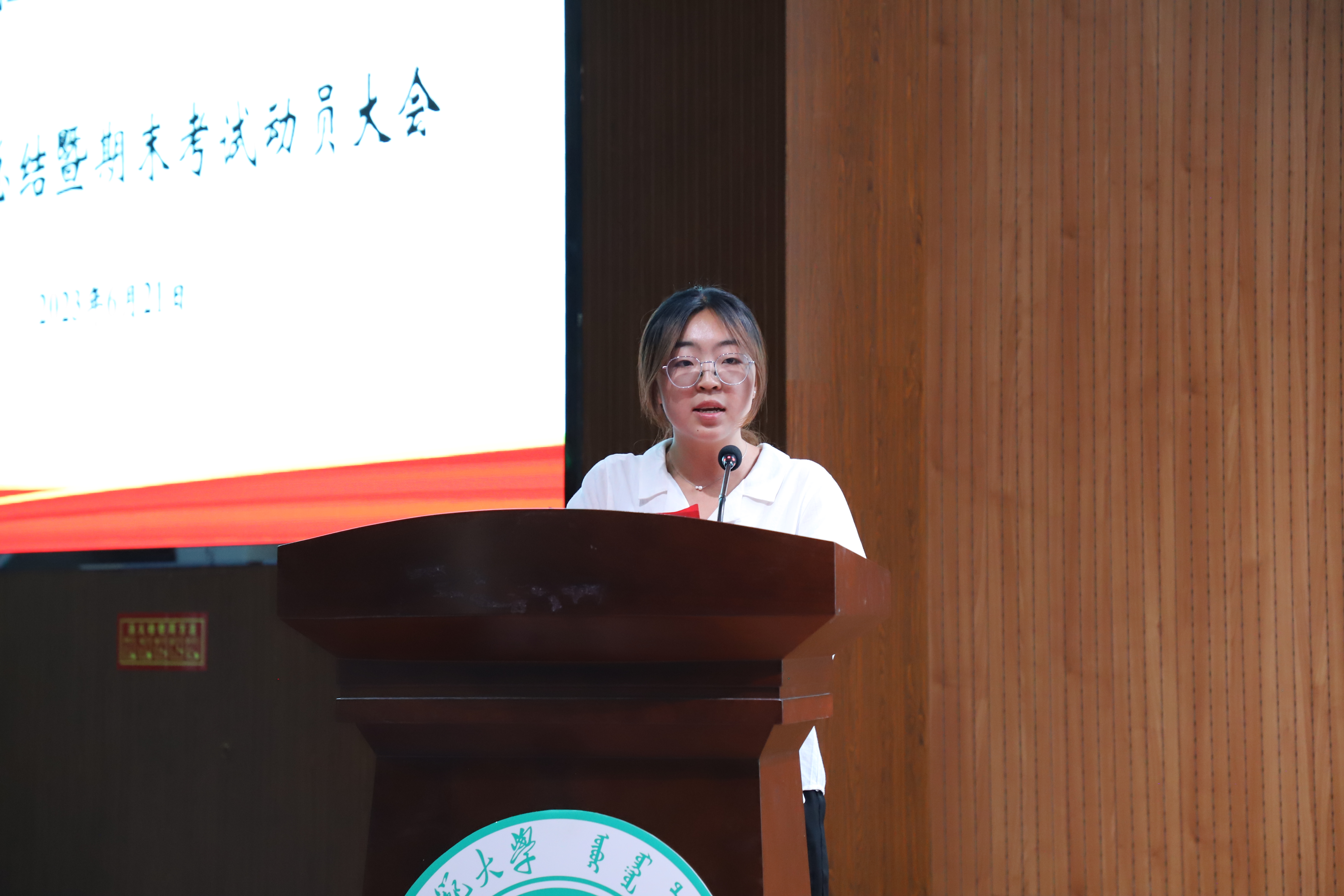 2023年6月21日晚七点,sjb世俱杯官方网站于图书馆二楼报告厅举行了世俱杯2022—2023学年第二学期学生工作总结暨期末考试动员大会。出席本次会议的有学院院长扎其劳教授,学院党委副书记、副院长季建光老师,学院副院长包霞老师,团总支书记皮建东老师,学生工作辅导员萨如拉老师,学生工作辅导员阿茹罕老师,21级汉一班班主任李春兰老师,21级蒙班班主任乌日柴胡老师,21级汉四班班主任高兴华老师,21级信息班班主任赵学慧老师,22级一班班主任李璐老师,22级二班班主任郑佳璇老师,22级三班班主任苏日古嘎老师,22级四班班主任朱建波老师,22级五班班主任莘智老师,本次会议由学生工作与就业办公室副主任刘沙沙老师主持。