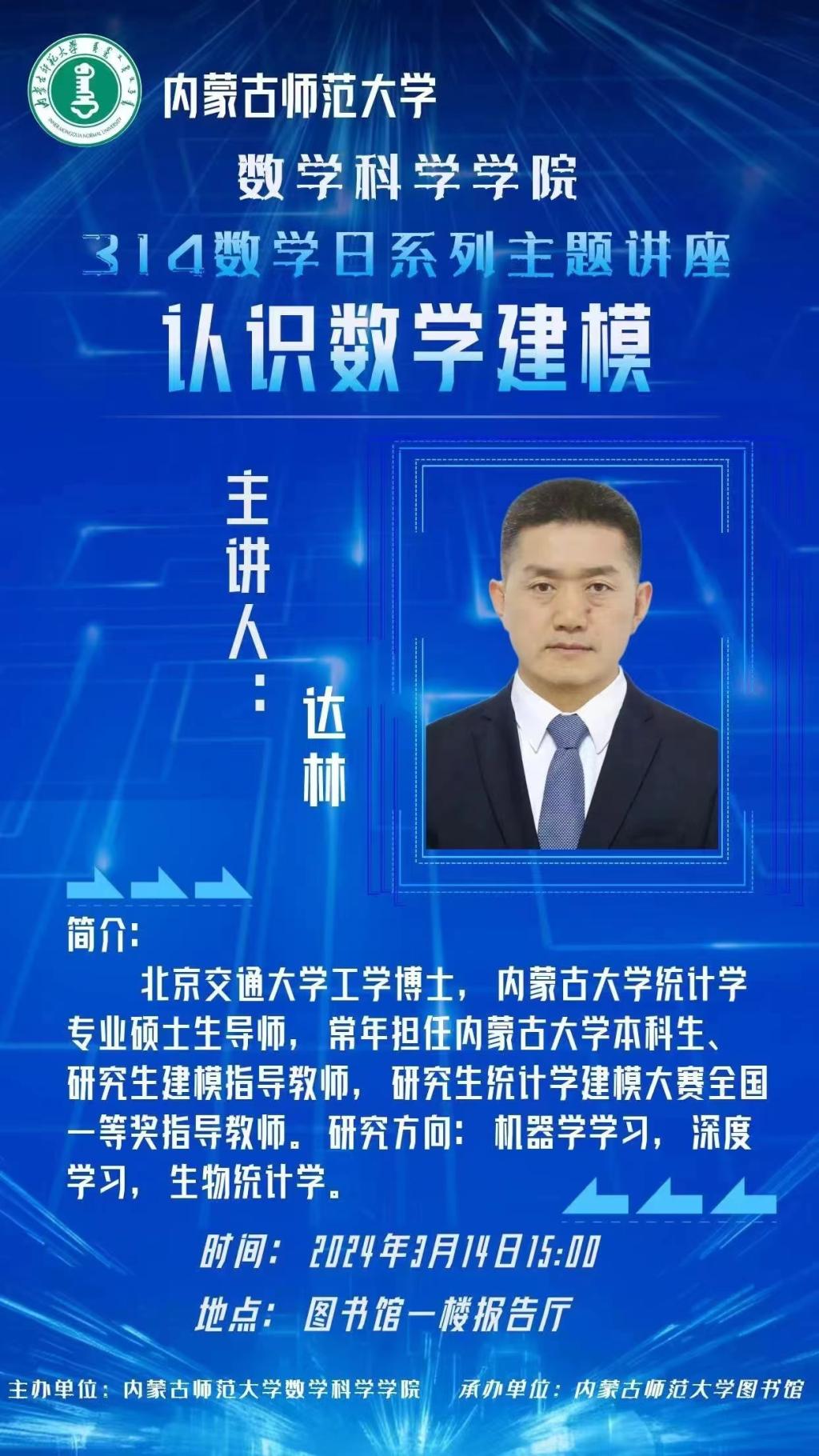 时值国际数学日,为进一步推动“一院一品”活动开展,鼓励和引导世俱杯学生踊跃参加数学建模竞赛,培养学生的创新思维和团队合作精神,激发同学们对于数学建模的学习兴趣,解答对数学建模的疑惑,3月14日下午,学院邀请内蒙古大学sjb世俱杯官方网站达林老师进行数学建模主题讲座。
