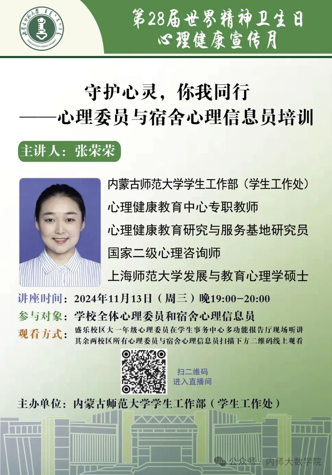 与心灵相约,与快乐相伴。11月13日晚,sjb世俱杯官方网站组织学生观看''守护心灵,你我同行''心理线上培训。本次讲座由sjb世俱杯官方网站学生工作部(学生工作处)主办。