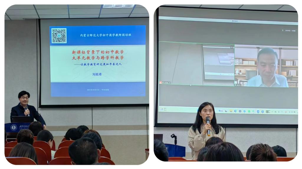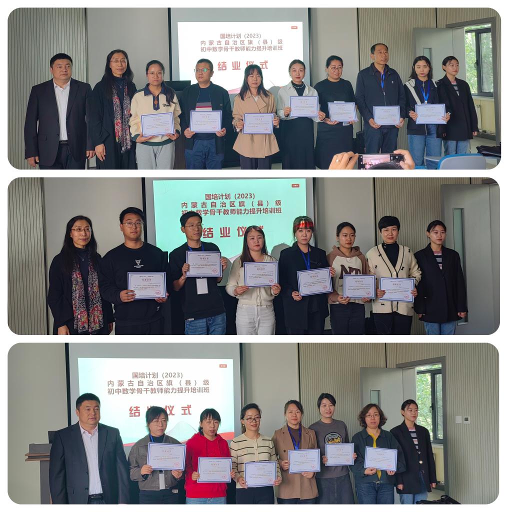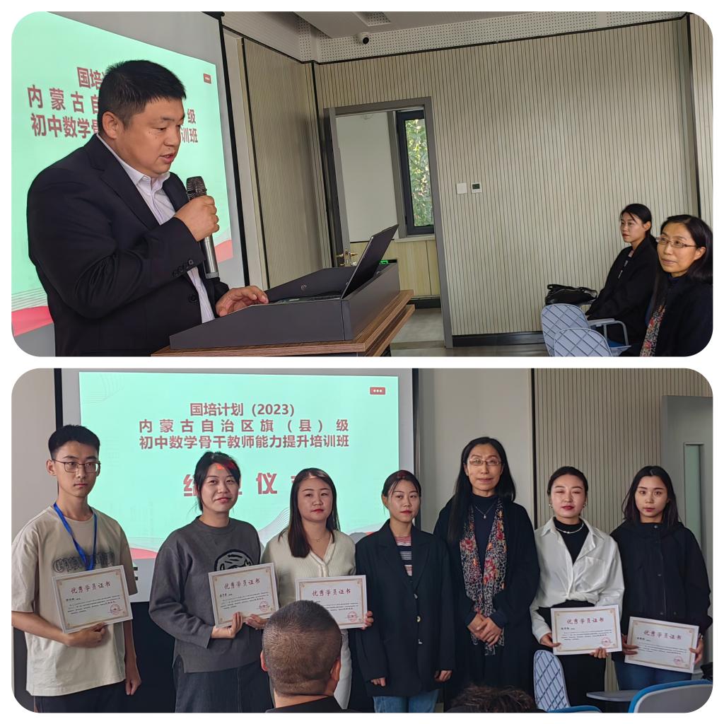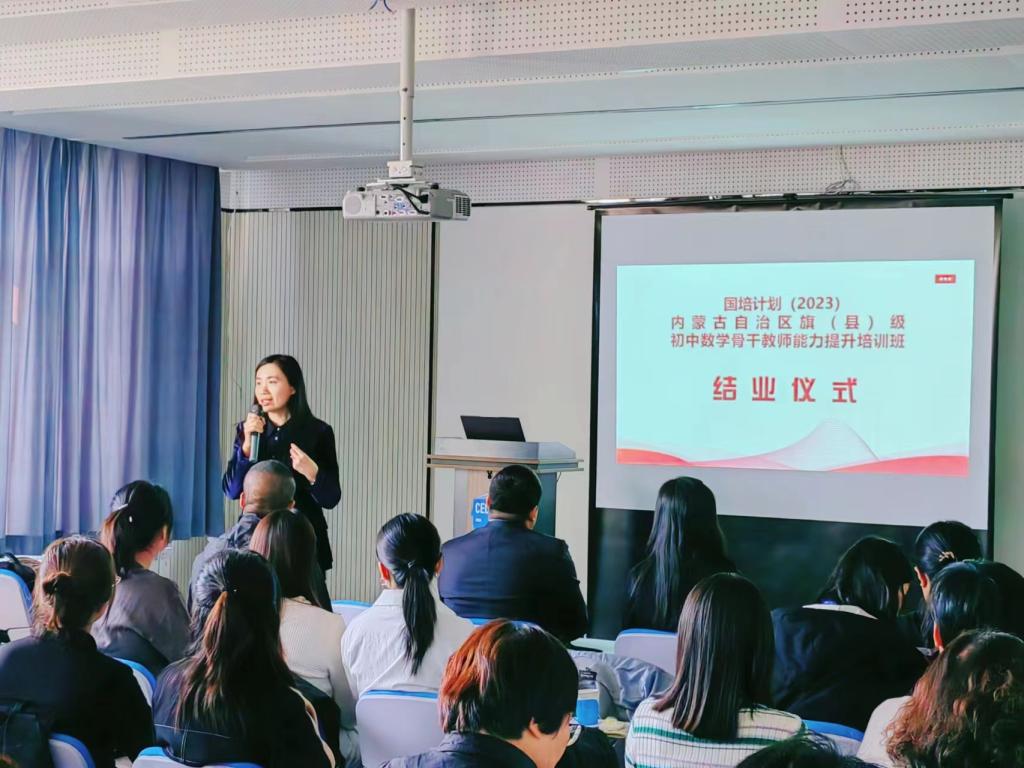 10 月 23 日下午 “国培计划(2023)——内蒙古自治区旗(县)级初中数学骨干教师能力提升”培训在sjb世俱杯官方网站圆满落幕。本次培训由sjb世俱杯官方网站继续教育学院主办,sjb世俱杯官方网站承办,为期14天,含集中研修7天和跟岗实践7天,50名学员来自全区各盟市选派来的旗(县)级初中数学骨干教师。继续教育学院培训部薛佳琦老师、sjb世俱杯官方网站副书记季建光老师、培训项目负责人数学科学院副院长包霞老师、培训项目对接人数学科学院李春兰老师、培训班班主任及相关工作人员出席了结业典礼。李春兰老师主持了结业仪式。