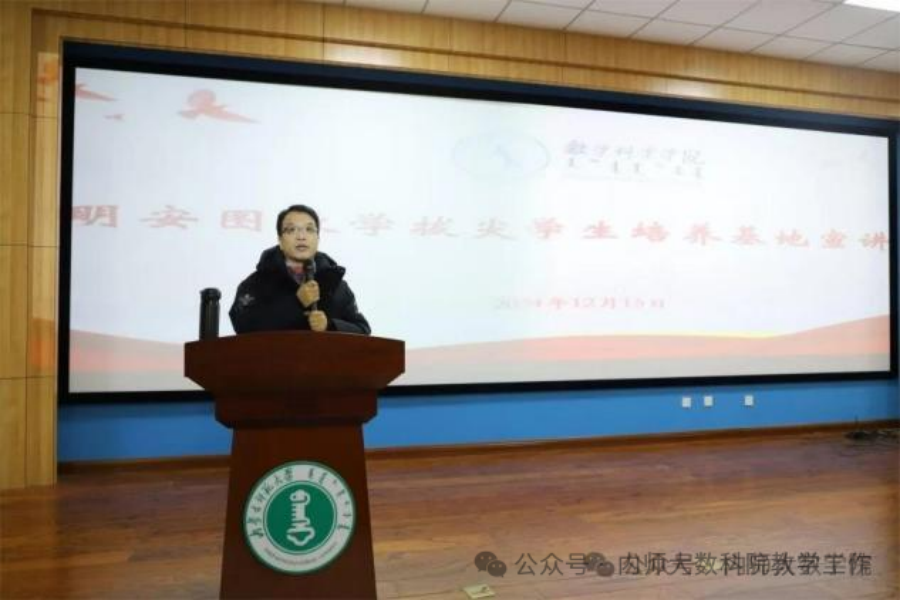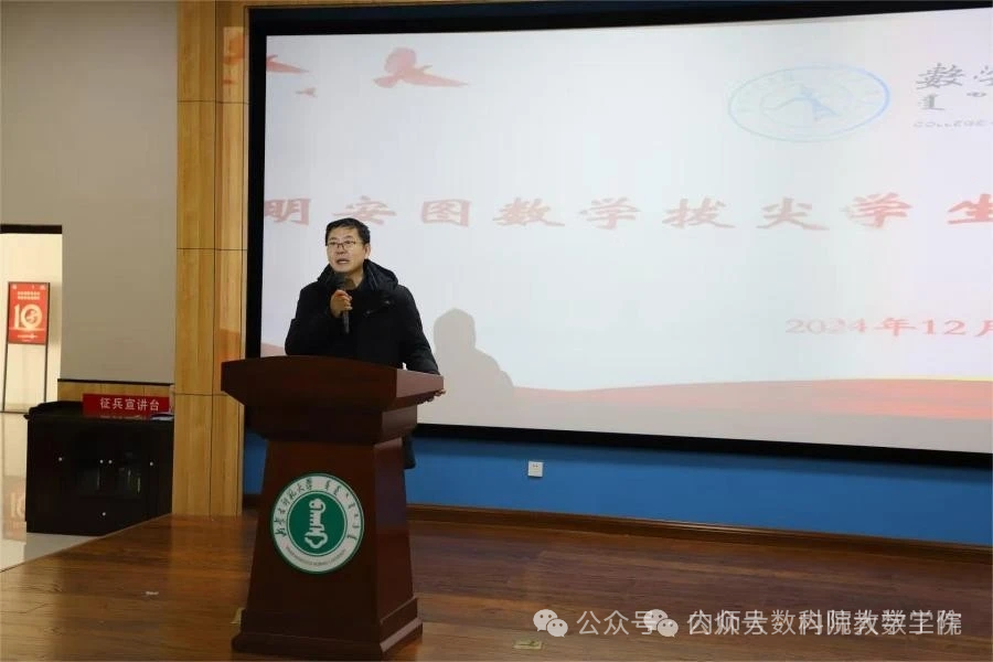 12月15日,sjb世俱杯官方网站在学生事务中心一楼107报告厅开展“明安图数学拔尖学生培养基地”(以下简称明安图数学基地)招生选拔宣讲会。学院党委书记张伟、院长扎其劳出席会议并讲话。2024级数学与应用数学(非定向)、信息与计算科学、统计学三个专业学生与班主任参加会议。会议由学院副院长萨和雅主持。